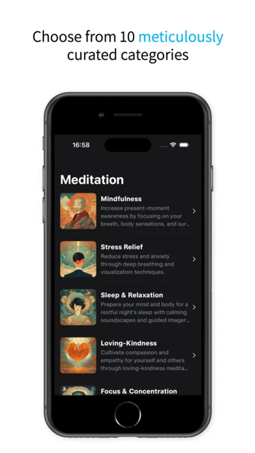 Diverse Meditation Categories: Choose from 10 meticulously curated categories including Mindfulness, Stress Relief, Sleep & Relaxation, Loving-Kindness, and more. Each category is tailored to address specific aspects of your well-being.