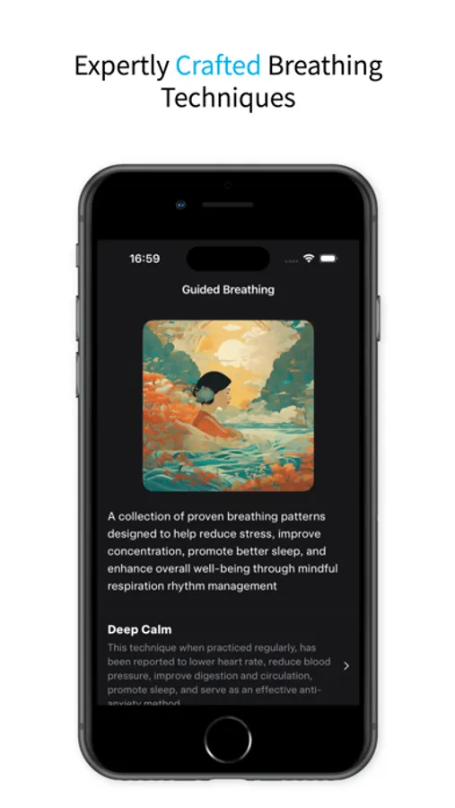 Expertly Crafted Breathing Techniques: Explore 5 powerful breathing techniques like Deep Calm, Box Breathing, and Diaphragmatic Breathing. These practices are designed to improve relaxation, focus, and overall health.