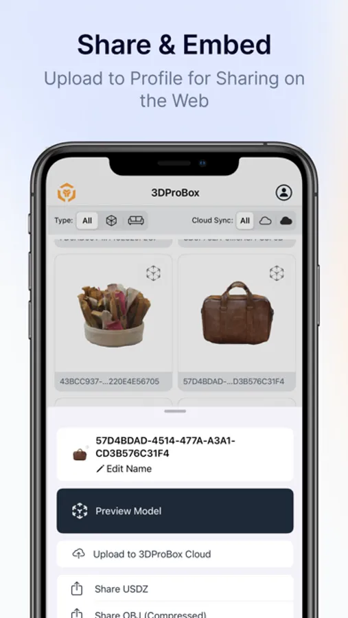 Unlock the power of 3D modeling for your business with 3DProBox - 3D Scanner. Scan objects in 3D using your Apple device with a LiDAR sensor and upload your models directly to your profile. Customize scenes on our web platform, share your creations publicly or privately, and embed your models on web pages. Seamlessly upload model files in .glb, .gltf, .fbx, .dae, and .obj formats and enhance your 3D projects with ease. As an essential companion to our web platform, this app empowers users to create, share, and explore 3D models effortlessly.