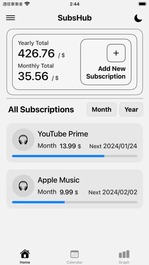 Whether it’s monthly, yearly, or every 3 months, SubsHub automatically updates your billing cycles and displays your spending with clean visuals like graphs and calendars.