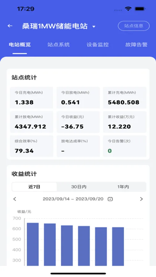 能量管理 App 支持储能、光伏及充电设备接入,统一控制。支持不同运营商接入,各运营商数据完全隔离。灵活生成日、月、年度运行数据报表及收益数据。