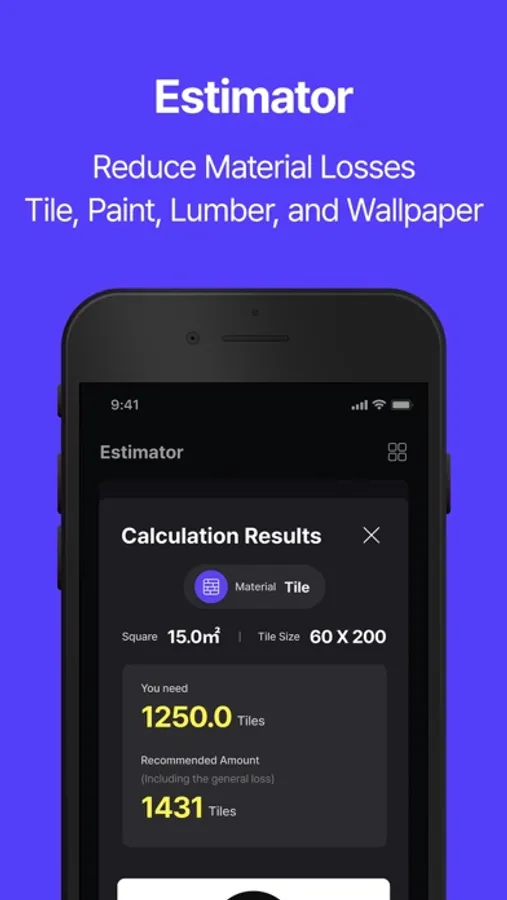Calculation mode is perfect for projects that require paint, wallpaper, tile or wood. Inputting the data into the app or seleting it from the records will estimate the quantity needed to cover a certain area with the selected material. Helping you save project time and material costs by lowering spend on unnecessary materials.