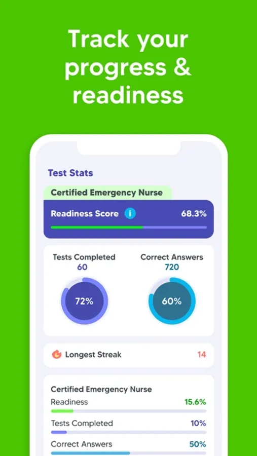 Additionally, our mobile app provides a personalized study plan based on your skill level, study frequency, and target test date. Not sure when you want to take the exam? You can adjust your study plan as often as you like. Our proprietary readiness score will help you determine when you’re ready to take the real Certified Emergency Nurse exam and pass with a high score on your first try.