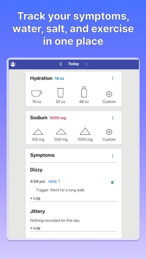 • Sodium Tracker: Monitoring sodium intake can be crucial for managing POTS, and the sodium tracker simplifies this task. Like the hydration tracker, it provides quick logging with preset amounts or the option for custom entries, ensuring you're meeting your sodium needs effortlessly.