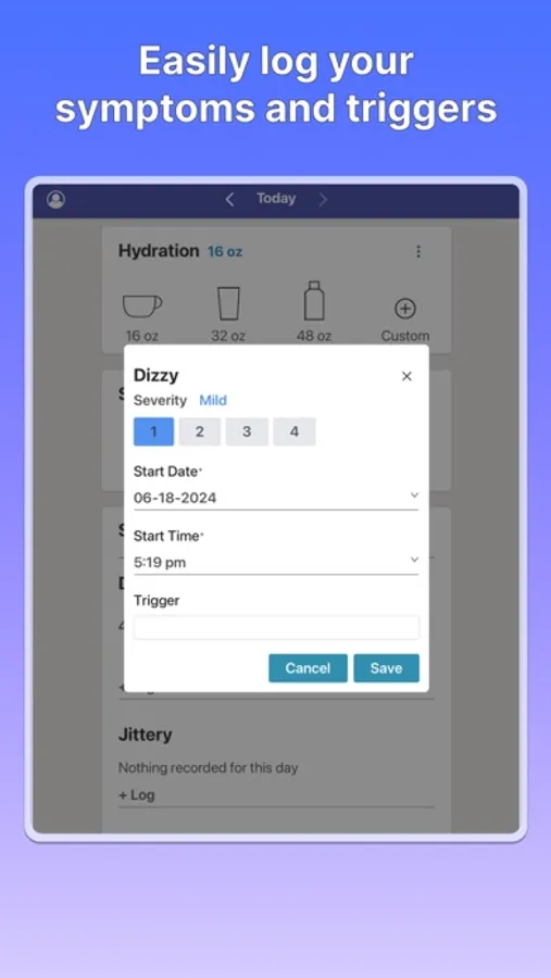• Symptom Tracker: Managing POTS involves keeping track of various symptoms that can fluctuate daily. The symptom tracker allows you to quickly log your symptoms such as dizziness, fatigue, heart rate, and more, their severity, and your triggers.