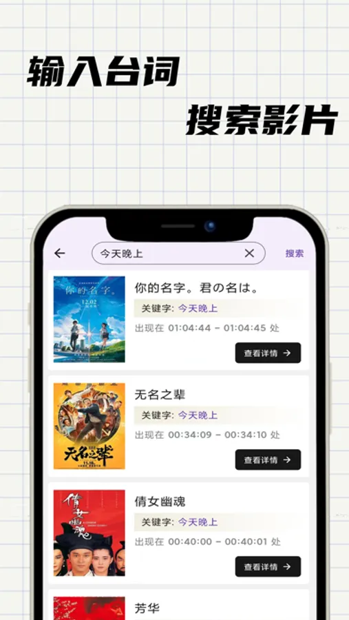 台词快搜是一款专业的免费的资源搜索工具,主要功能是根据台词关键字快速找到影片,精确定位到出现的时间点。