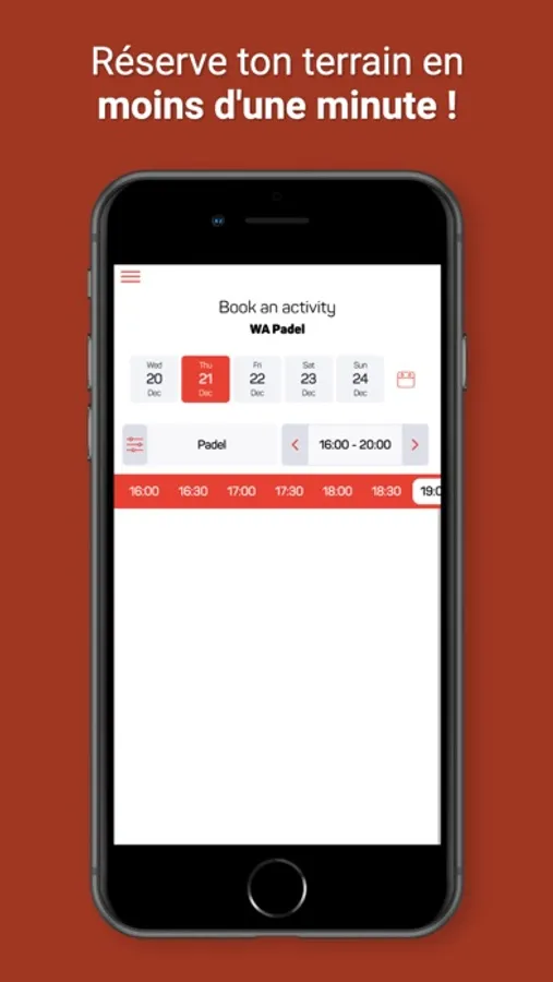 Fini la corvée de réservation ! Avec l'application tu n'as plus qu'à accéder aux créneaux disponibles et à en choisir un. Le club recevra alors automatiquement ta réservation.