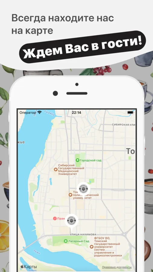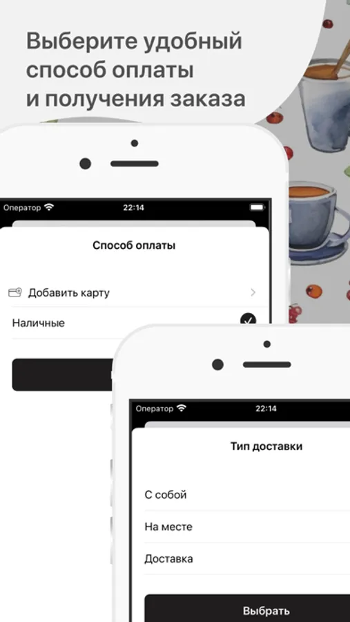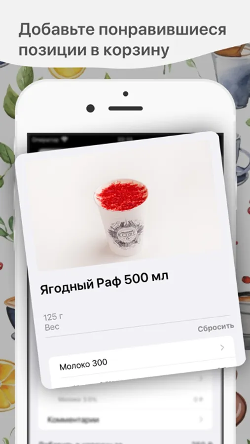 Как сделать заказ в приложении “Территория Кофе”: выберите понравившиеся позиции из меню, добавьте их в корзину и перейдите на экран оформления заказа (по нажатию на иконку корзины).