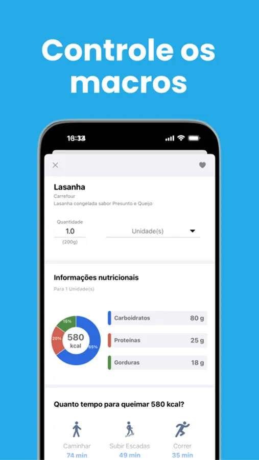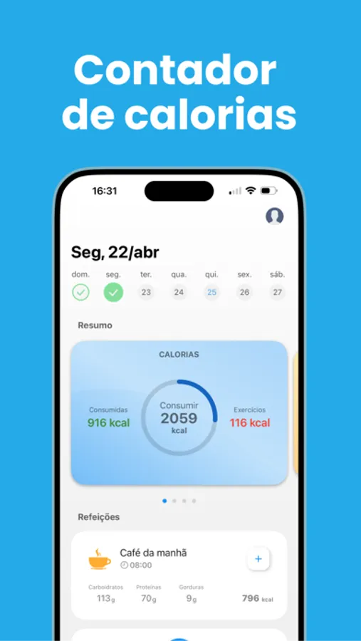 - Acompanhe seu consumo de calorias e macros (carboidratos, proteínas e gorduras)