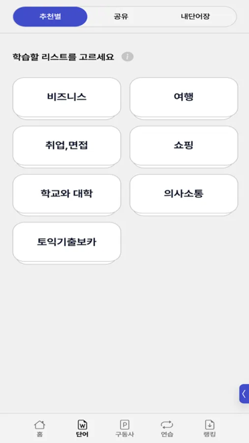 Choose from curated lists like Business, Travel, Job Hunting, Shopping, TOEIC Vocabulary, and more.