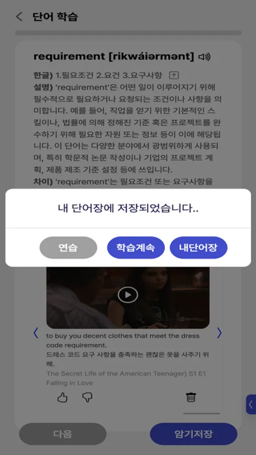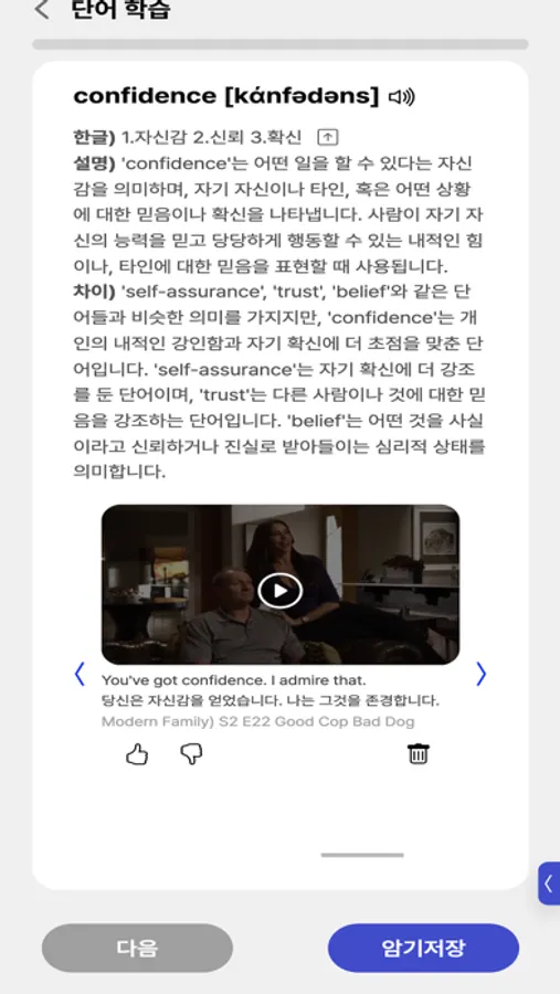 Each word comes with detailed explanations, differences from similar expressions, and 5 video clips from dramas, movies, and YouTube.