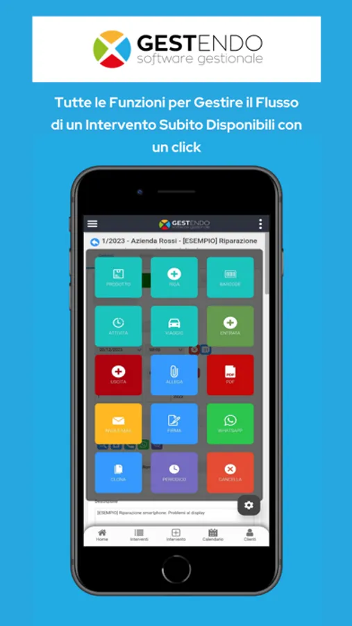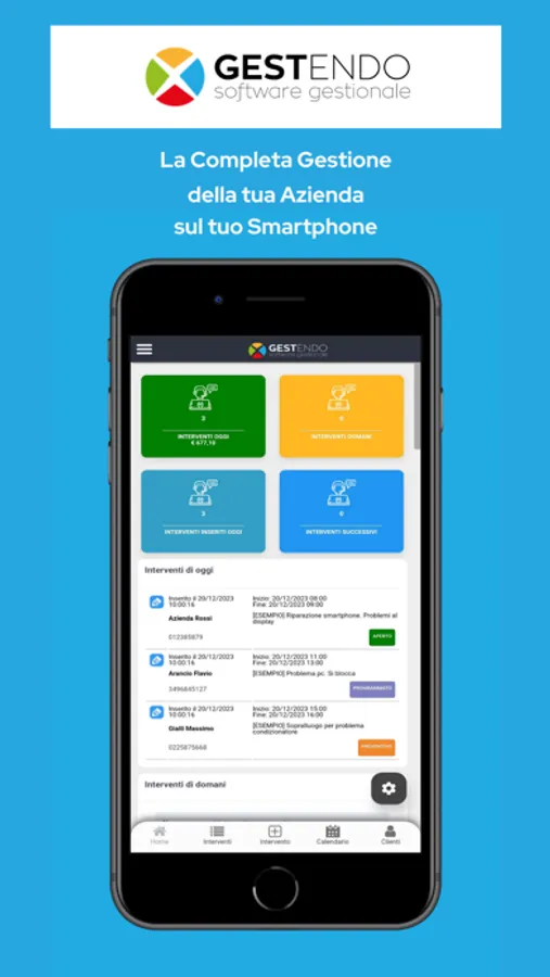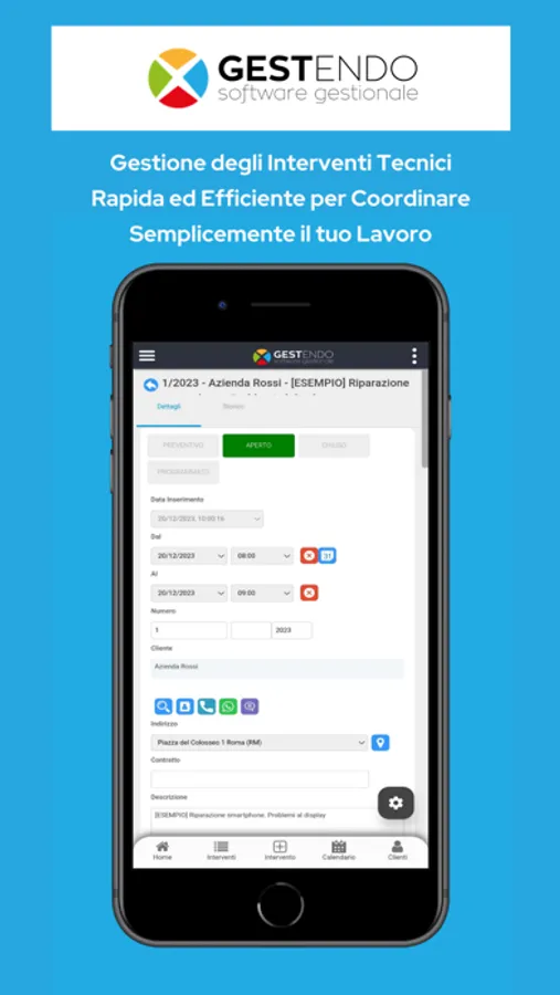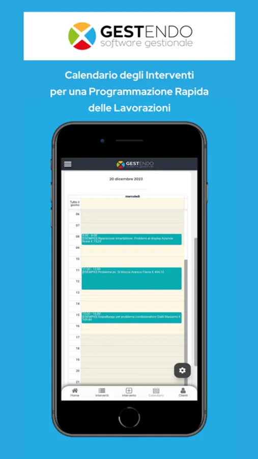 Con Gestendo hai un calendario degli interventi di assistenza tecnica a portata di mano con visione mensile, settimanale e quotidiana. Potrai inoltre, con un semplice click, inserire i tuoi appuntamenti su Google Calendar.