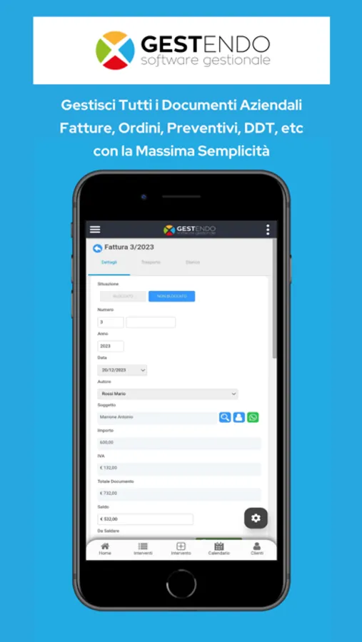 Tutti i documenti (fatture, ordini, preventivi, bolle, rapportini di intervento) potranno essere stampati con un semplice click. Sarà inoltre possibile esportarli in formato .pdf