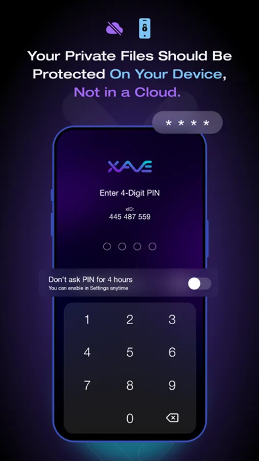 Xave is Secure Encrypted Space on your device which allows you to store private and confidential data locally. This allows you to take your private data wherever you go. Furthermore, all files are encrypted at rest on your device instead of the cloud. When the app is not in use, it is protected with several layers of authentication before it can be accessed. Anytime you leave the app, it will require you to re-enter your 4-digit PIN and uses biometric authentication if that feature has been enabled.