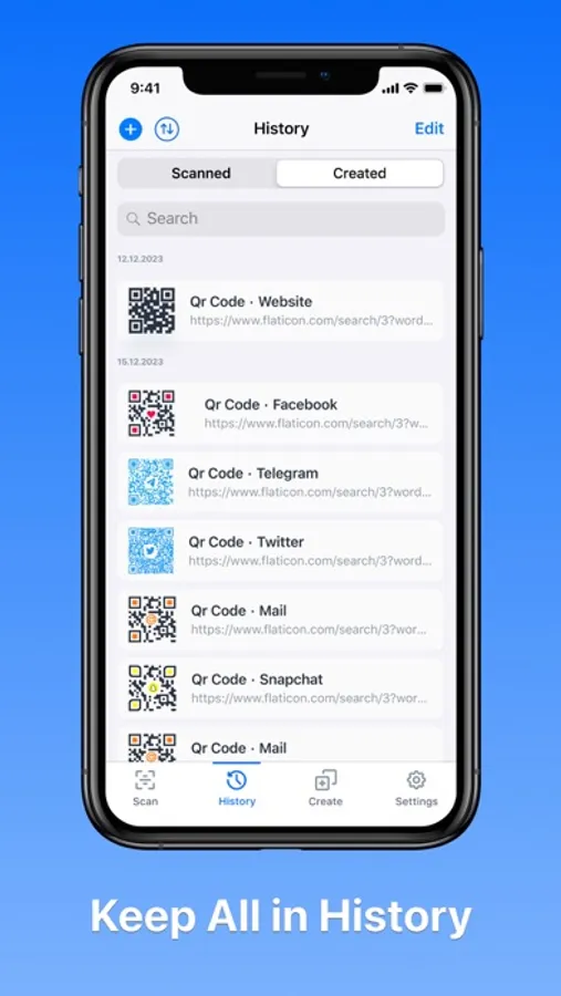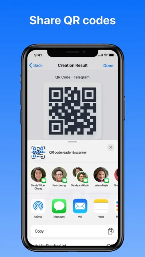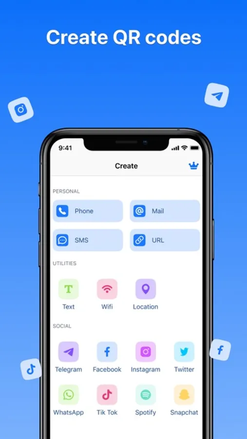 - Create QR Codes & Share: Generate an array of QR codes, including: Phone, Email, SMS, URL, Text, Wifi, Location, Telegram, Facebook, Instagram, Twitter, WhatsApp, TikTok, Spotify, and Snapchat. Share your QR code reader and scanner results effortlessly through popular platforms like Telegram, WhatsApp, Facebook, Twitter, Gmail, WeChat, Line, E-mail, and SMS.