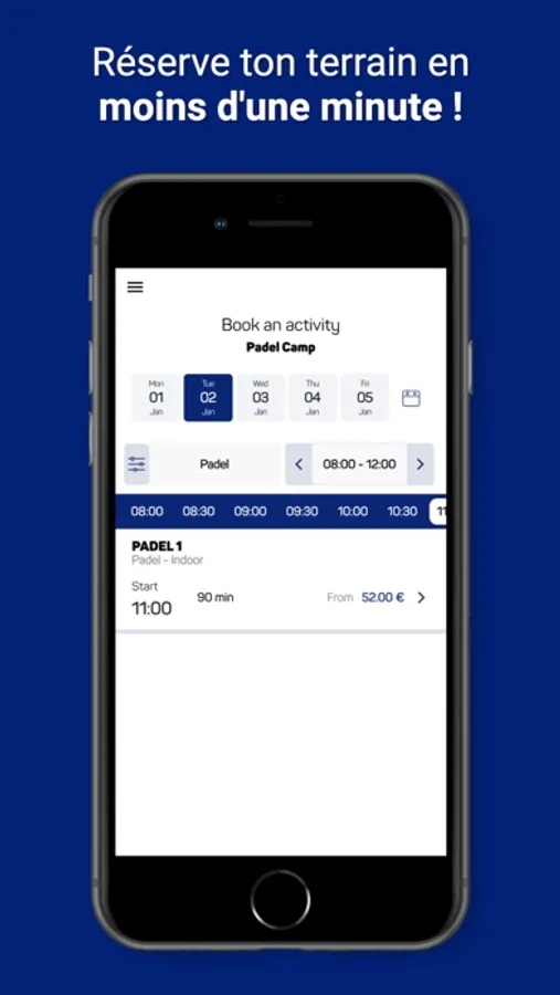 Fini la corvée de réservation ! Avec l'application tu n'as plus qu'à accéder aux créneaux disponibles et à en choisir un. Le club recevra alors automatiquement ta réservation.