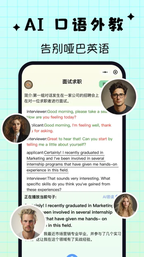 * 采用最新大模型AI,即时生成回答,每次对话不重复,反复练习不枯燥,轻松学会同一话题的多种语法表达。