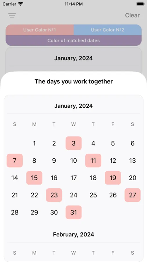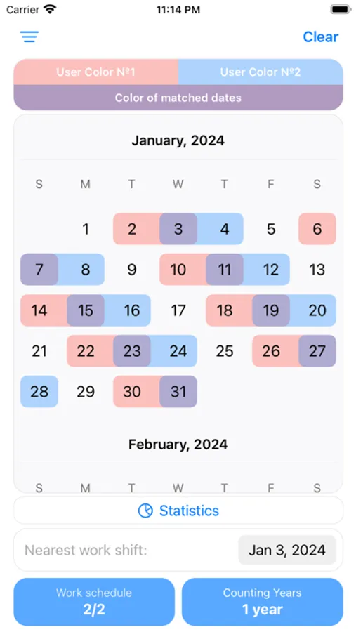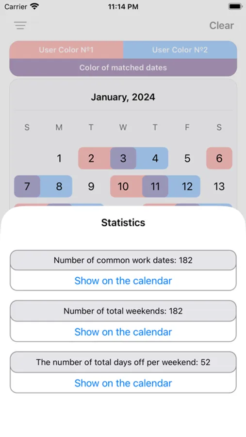 - Common Days Analysis: Users can analyze how many times per month or per year they have overlapping weekends with common days off. This feature helps to plan vacations, business meetings and other activities by taking into account free time and holidays.