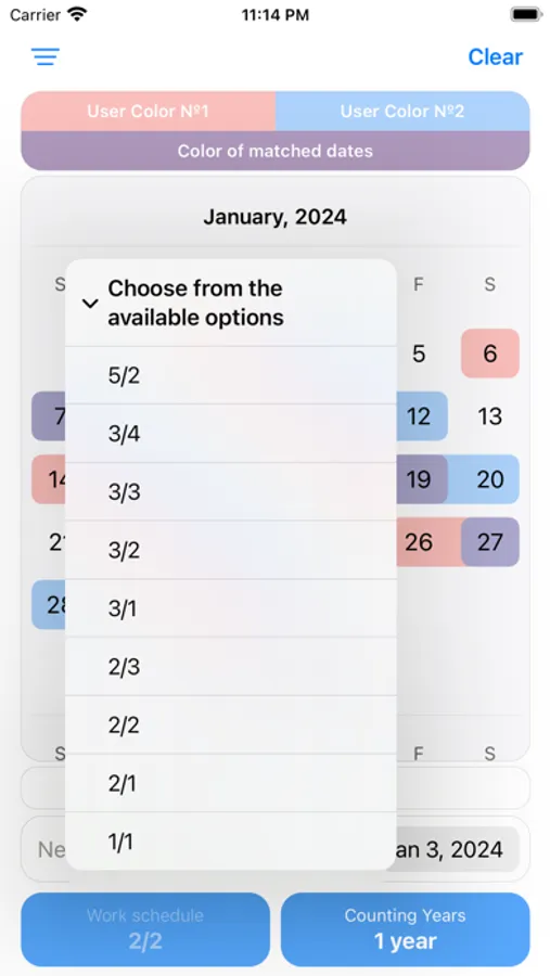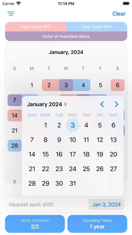 - Visualization on calendar: After selecting a schedule, users can view it on a calendar. Each weekday and weekend will be displayed in the corresponding color, providing a clear understanding of the working time structure.