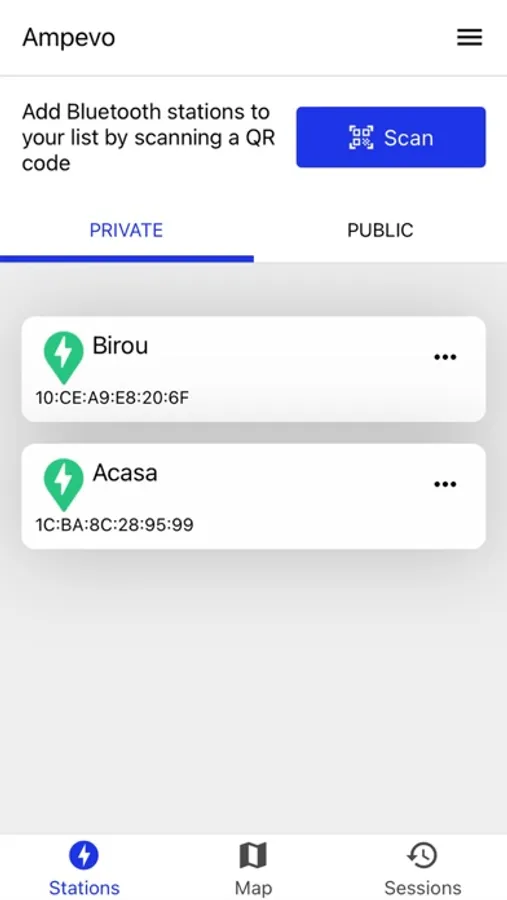 This application allows you to connect to the Ampevo-CP charging stations. The connection with the station is made via bluetooth. To connect to the charging station using the app, you must scan the charger's QR code and enter the charging station’s user PIN code. After you are connected you can visualize if an electric vehicle is connected to the station, start and stop the charging of the connected electric vehicle and see the power consumption in real time.