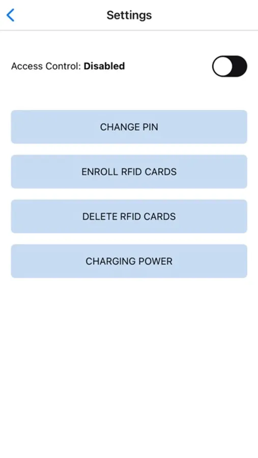 To access and change the charging station’s settings and configuration you must go to Settings and use the administrator’s PIN code.