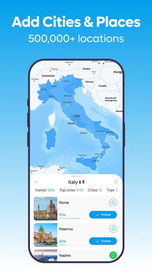 Go beyond countries — track cities and famous landmarks. Explore over 500,000 places worldwide.