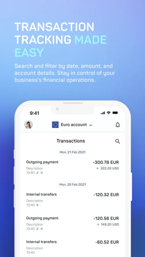 Transaction Tracking Made Easy: Track business transactions with ease. Search and filter by date, amount, and account details. Stay in control of your business's financial operations.