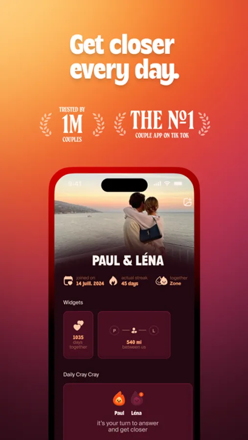 - "Lets you talk about new subjects and feel close again. It's the best relationship app we've tried!!" Marcel, France