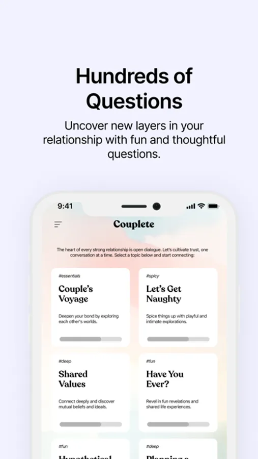 Connect and Grow with Couplete: Elevate your relationship through meaningful conversations. Explore hundreds of engaging questions and fun action cards designed to deepen your bond. Free, easy, and wonderfully romantic!