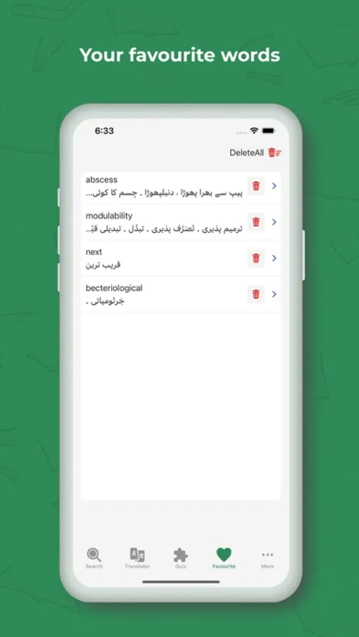 Save your favourite word meanings with ease! Just tap the heart icon, and we'll automatically add the word to your favourites list. Access your saved words effortlessly anytime you want through the 'Favourites' option in the tab bar at the bottom.