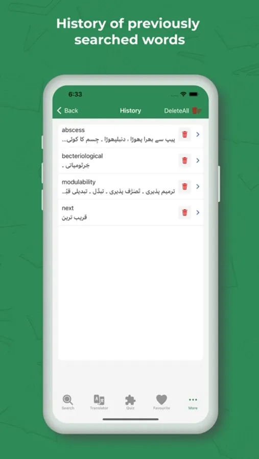 We take the history of previously searched words in English to Urdu Dictionary Offline App. Easily access and review your past searches, making it a breeze to revisit and reinforce your vocabulary. With this indispensable tool, your language mastery becomes a seamless and efficient process.