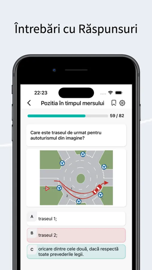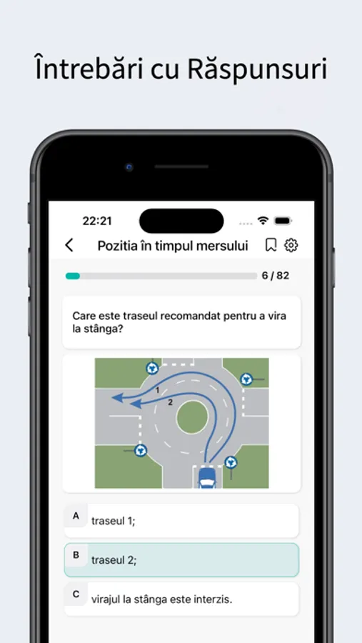 - Teste model cu întrebări de marcări rutiere, reguli de drum și comenzi vehicul.