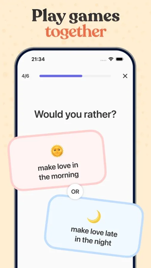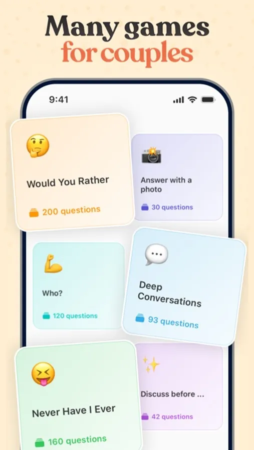 Play multiple couple games: Never have I ever, Would you rather, Who's most likely to, Deep conversations, This or That and much more!