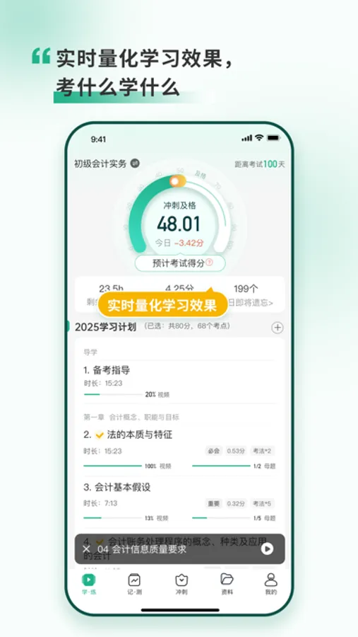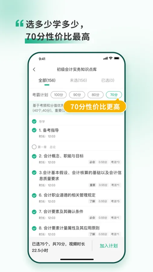 每个知识点标明考频、分值和考法,学生可快选70分、80分、90分等学习计划,研究发现,70%分值只有35%的知识点数;