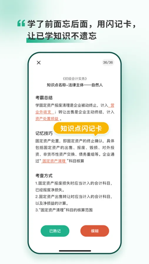 闪记卡极大精简了多次复习的时间和形式,每个知识点只需要20秒可完成一次复习,大大节省了复习时间,彻底摆脱“学了后面忘前面”的问题。