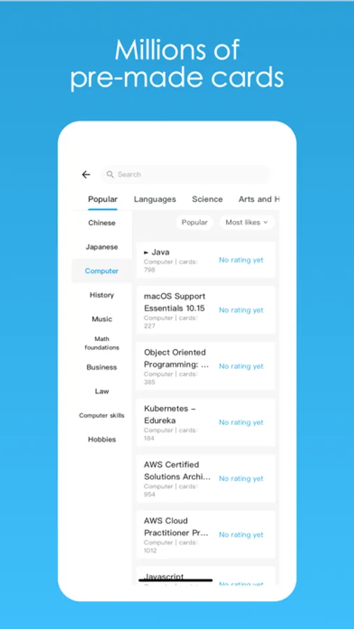 - Millions of pre-made cards covering various subjects, majors, exams, interests and other fields.