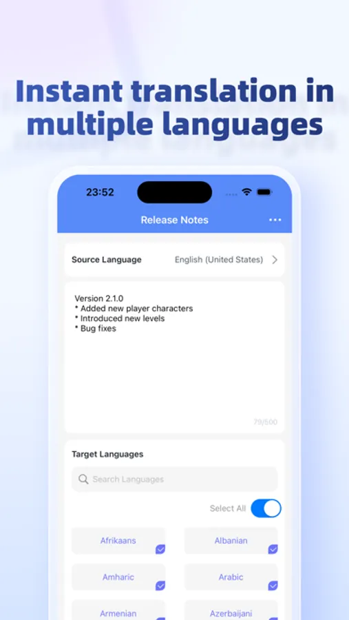 Rapid Translation Across 87 Languages: With support for 87 languages from the Play Console, Release Notes Assistant allows you to instantly translate your Release Notes Assistant, making your app accessible to a worldwide audience.