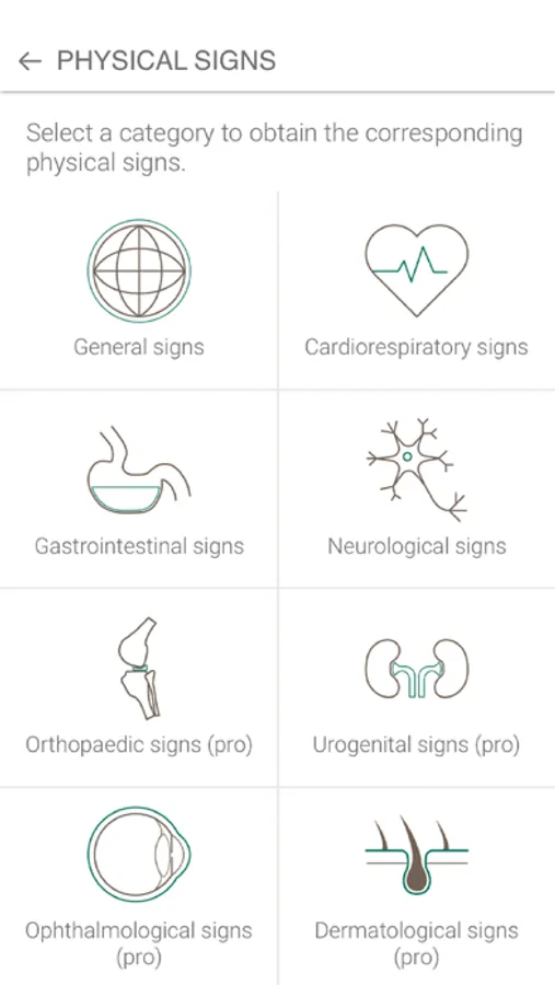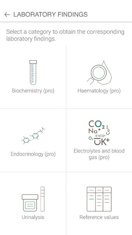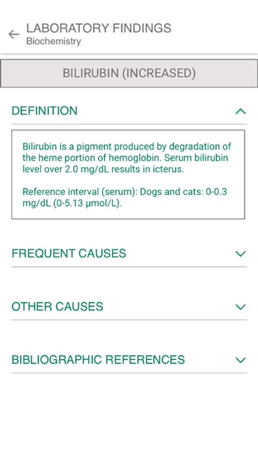 In order to facilitate research, the clinical signs reported by the animal's guardian or observed by the veterinarian are grouped into categories: general signs, cardio-respiratory signs, gastrointestinal signs, neurological signs, orthopedic signs (premium version), uro-genital signs (premium version), ophthalmological signs (premium version), dermatological signs (premium version). Similarly, laboratory results are also grouped by categories: urinalysis, hematology (premium version), biochemistry (premium version), endocrinology (premium version), electrolytes and blood gases (premium version). Laboratory analysis reference values are also provided. It is also possible for the user to directly search for the clinical sign or the laboratory result of interest using a search bar. When the user selects a clinical sign or a laboratory result, he obtains a definition of it as well as the corresponding differential diagnosis (frequent causes and rarer causes).