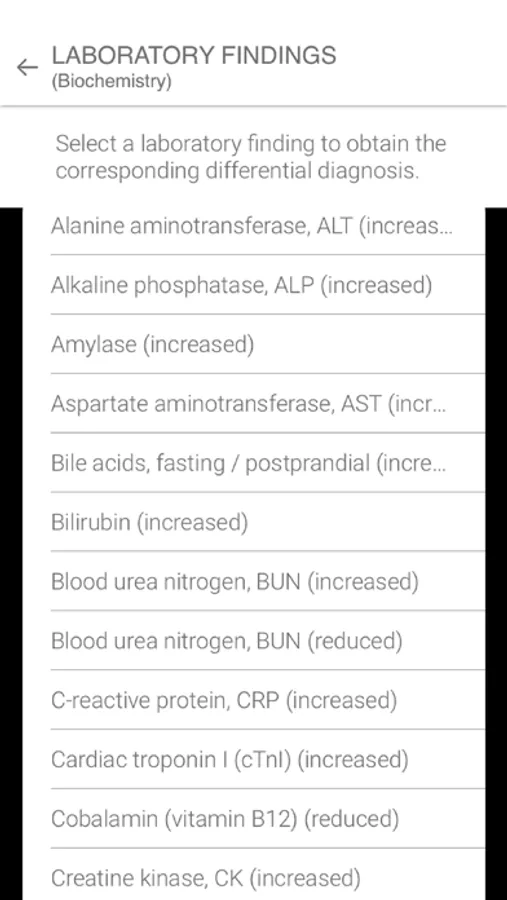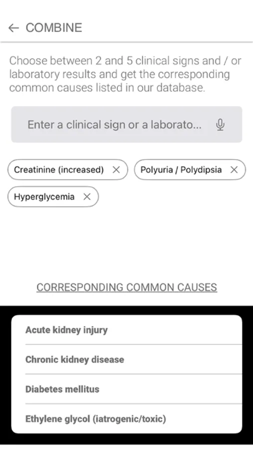 In the premium version, the user can also combine several clinical signs and/or laboratory results (between 2 and 5). The application will then display a reduced differential diagnosis corresponding to the common causes of these clinical signs and/or laboratory results.