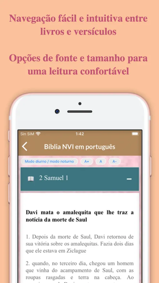 Personalização do Texto: A "Bíblia NVI em Português" oferece a opção de ajustar o tamanho do texto para uma leitura confortável, além de um modo noturno para reduzir a tensão ocular em ambientes com pouca luz.