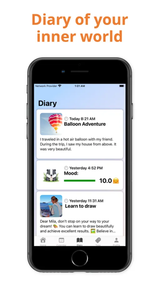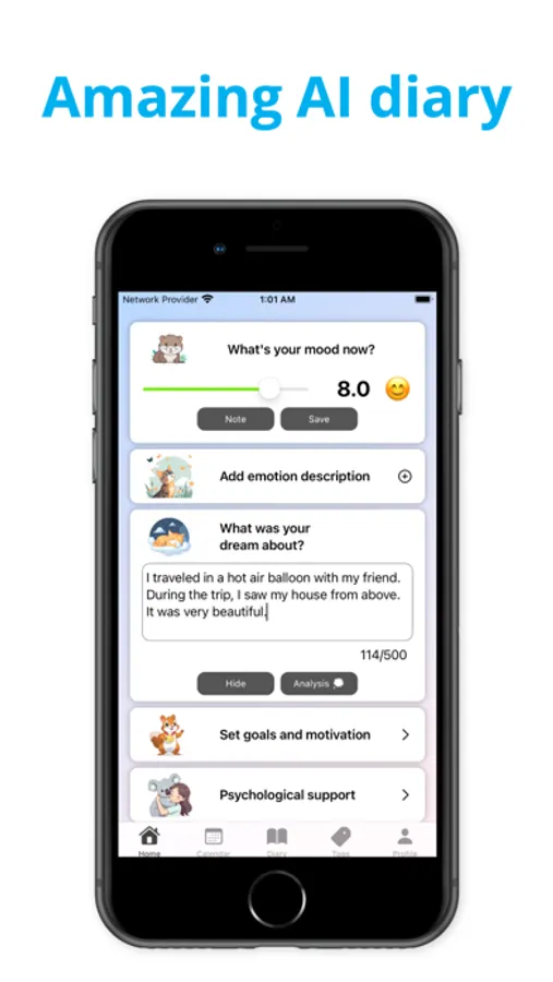 Mila Diary is an amazing AI diary of your inner world. Start recording your dreams, emotions and mood and instantly receive a detailed AI analysis.