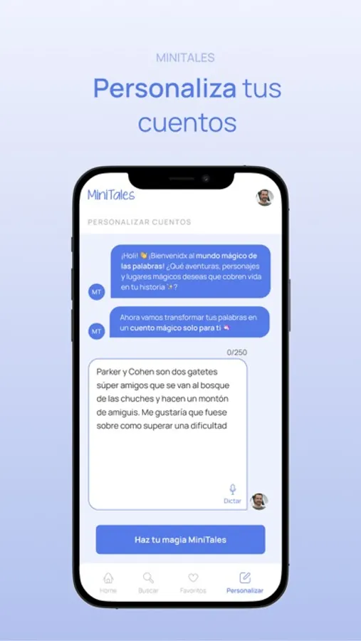 Con MiniTales puedes crear cuentos infantiles desde cero, adaptado a tu peque, cuéntale a MiniTales qué es lo que os apetece y tachán! tienes un cuento en segundos.