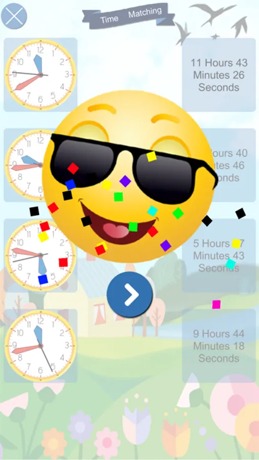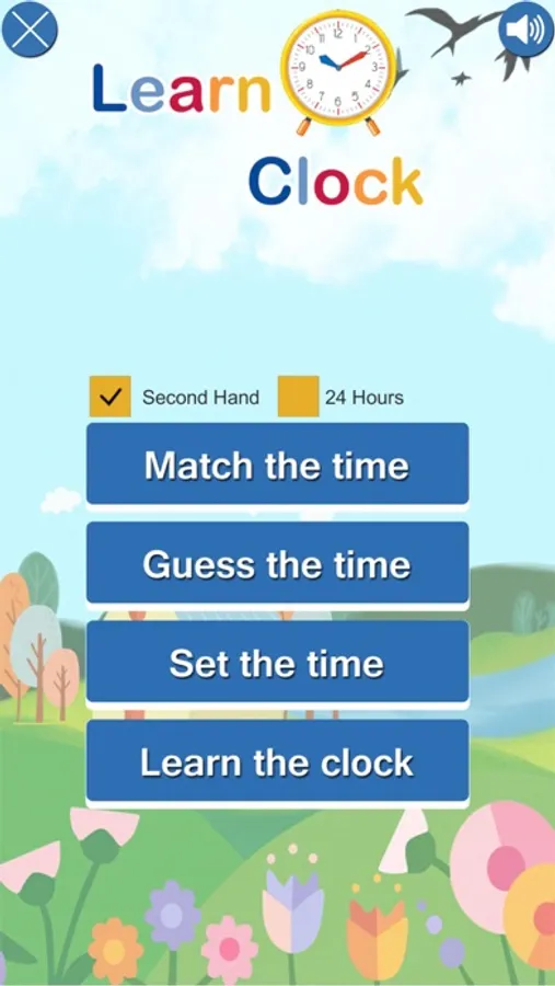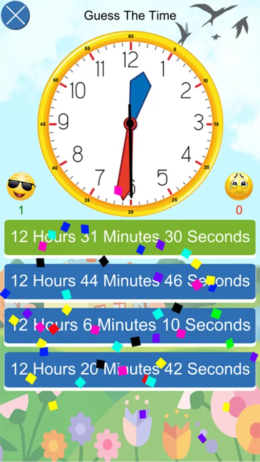 The guessing mode requires you to identify the time displayed on a clock from four possible options. Choose the correct option, and you'll be rewarded with a green mark and a clapping sound. An incorrect choice is marked with red and a buzzer sound.