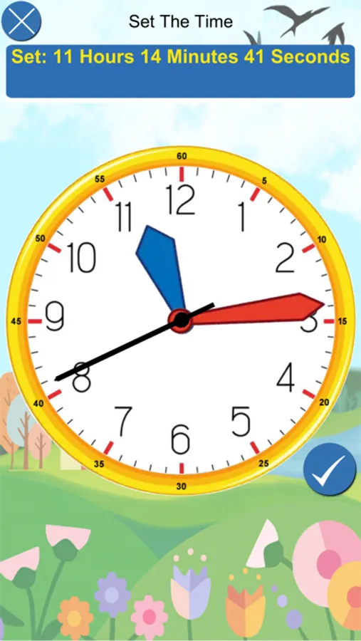 In the setting mode, you'll need to adjust the time on a clock based on a given question. Use your finger to position the hour, minute, and second hands correctly. You'll also have the correct time for reference.