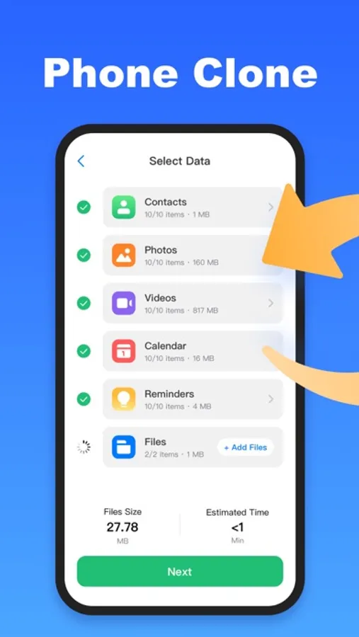 Phone Clone lets you quickly and seamlessly migrate all the basic data from your old phone to your new phone. You can transfer contacts, calendars, reminders, photos, videos, and files wirelessly between devices.