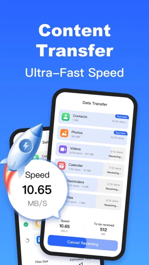 Transfer contacts, calendars, reminders, photos, videos, and files (like MP3, MP4, GIF, PPT, DOC, PDF).