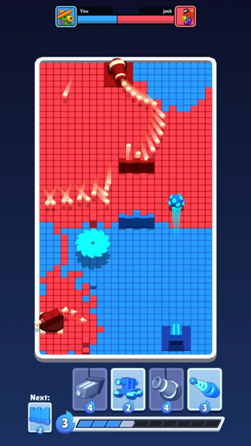 In this card game players fight between red and blue to capture territory by coloring the arena.