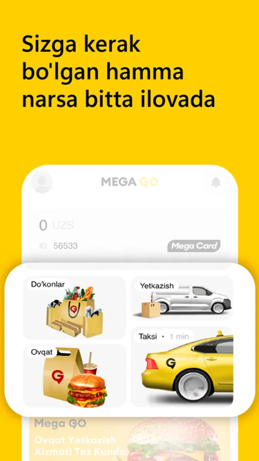 Mega Go ilovasi sizga yaqin joyda taksi topib beradi. Yetib kelish vaqti 3-10 daqiqa orasida.