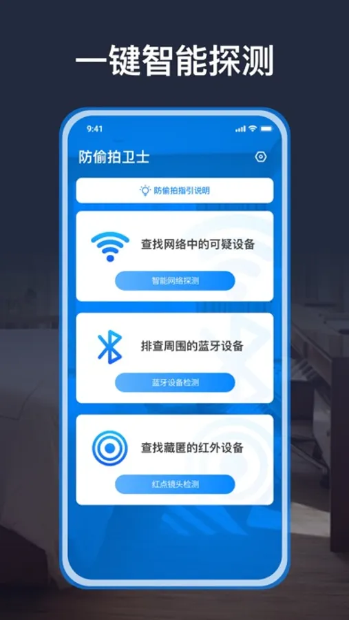 探眼是一款致力于保护用户隐私的实用工具应用。通过先进的探测技术,本应用能够全方位地检测各种类型的设备和预防偷拍行为,为用户提供全方位的隐私保护。