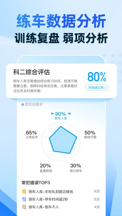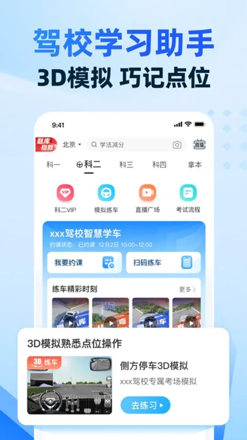 3)线下练车报告汇总,学员可辅助使用3D模拟对于线下驾校练习情况进行针对性复习巩固和提前预习; 3.界面简洁更轻快,广告更少免打扰 只围绕驾照考试核心服务,轻量设计,体验更顺畅,备考更集中;